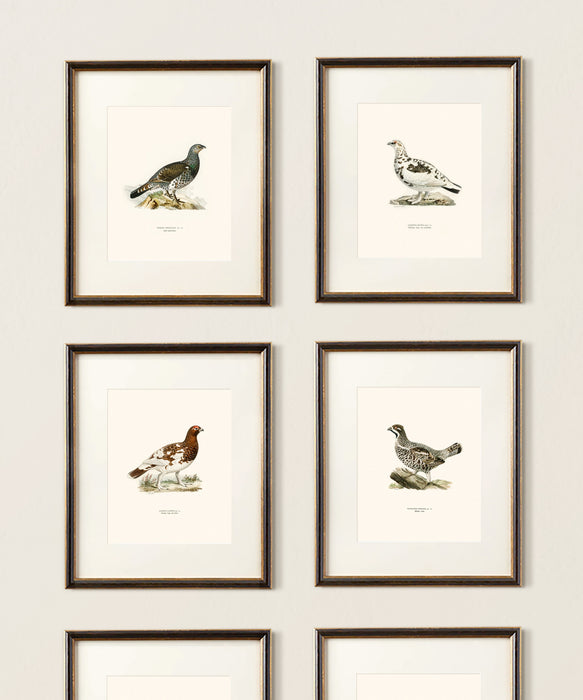 A collection of hand-illustrated game bird prints from the early 1900s.