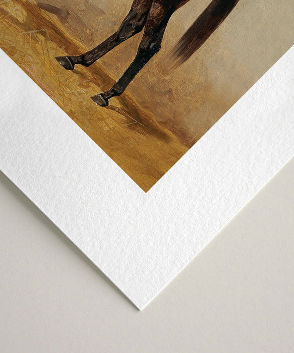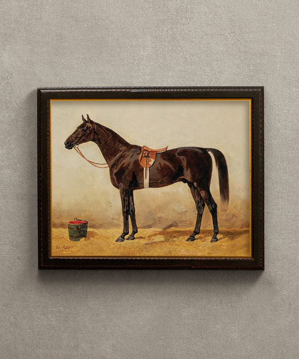This classic example of turn of the century sporting art depicts a saddled dark bay horse in a stable setting. Printed on 100% cotton stock using an archival giclée print process.
