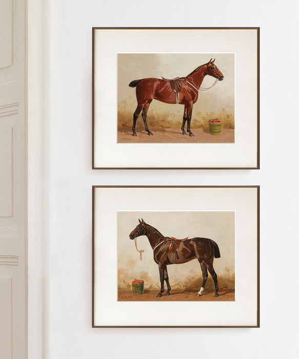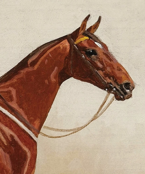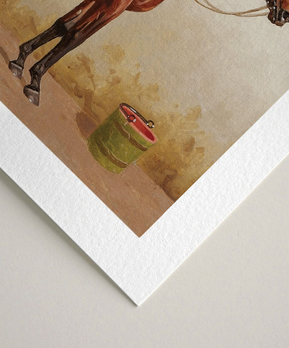 This classic example of turn of the century sporting art depicts a saddled bay horse in a stable setting. Printed on 100% cotton stock using an archival giclée print process.