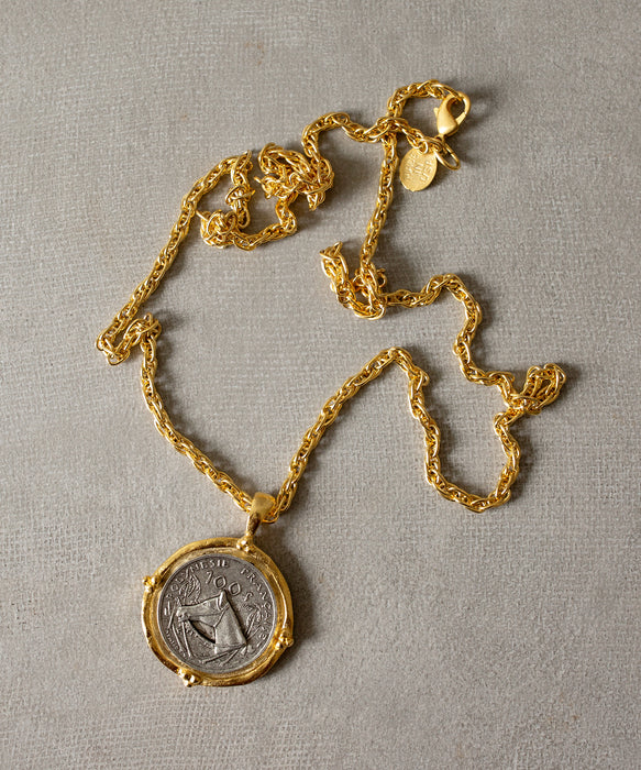 A charming mixed metal piece featuring a horse coin pendant on a long textured chain. Each necklace is hand cast and triple plated in 24 karat gold and sterling silver.