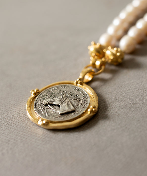 A charming mixed metal piece featuring a horse coin pendant on a chain of genuine freshwater pearls. Each necklace is hand cast and triple plated in 24 karat gold and sterling silver.